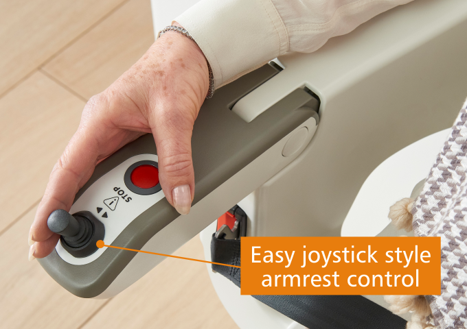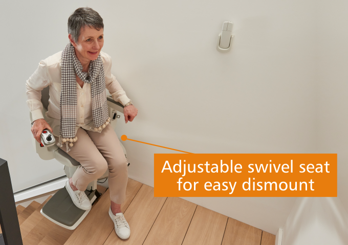 The swivel seat is designed to make getting on and off your stairlift easier and safer. A swivel seat rotates 90° to face your landing or hallway once you have finished your stairlift ride. This movement allows you to stand up from your stairlift without the need to shuffle or twist yourself around. Swivel seats can be operated manually or can be automated.