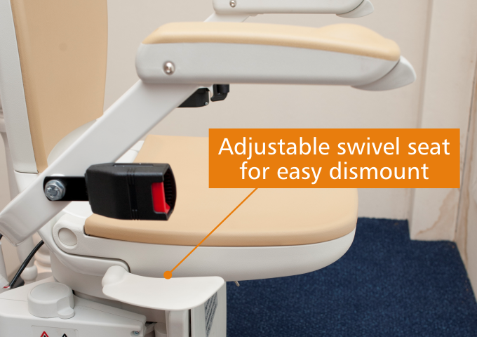 The swivel seat is designed to make getting on and off your stairlift easier and safer. A swivel seat rotates 90° to face your landing or hallway once you have finished your stairlift ride. This movement allows you to stand up from your stairlift without the need to shuffle or twist yourself around. Swivel seats can be operated manually or can be automated.